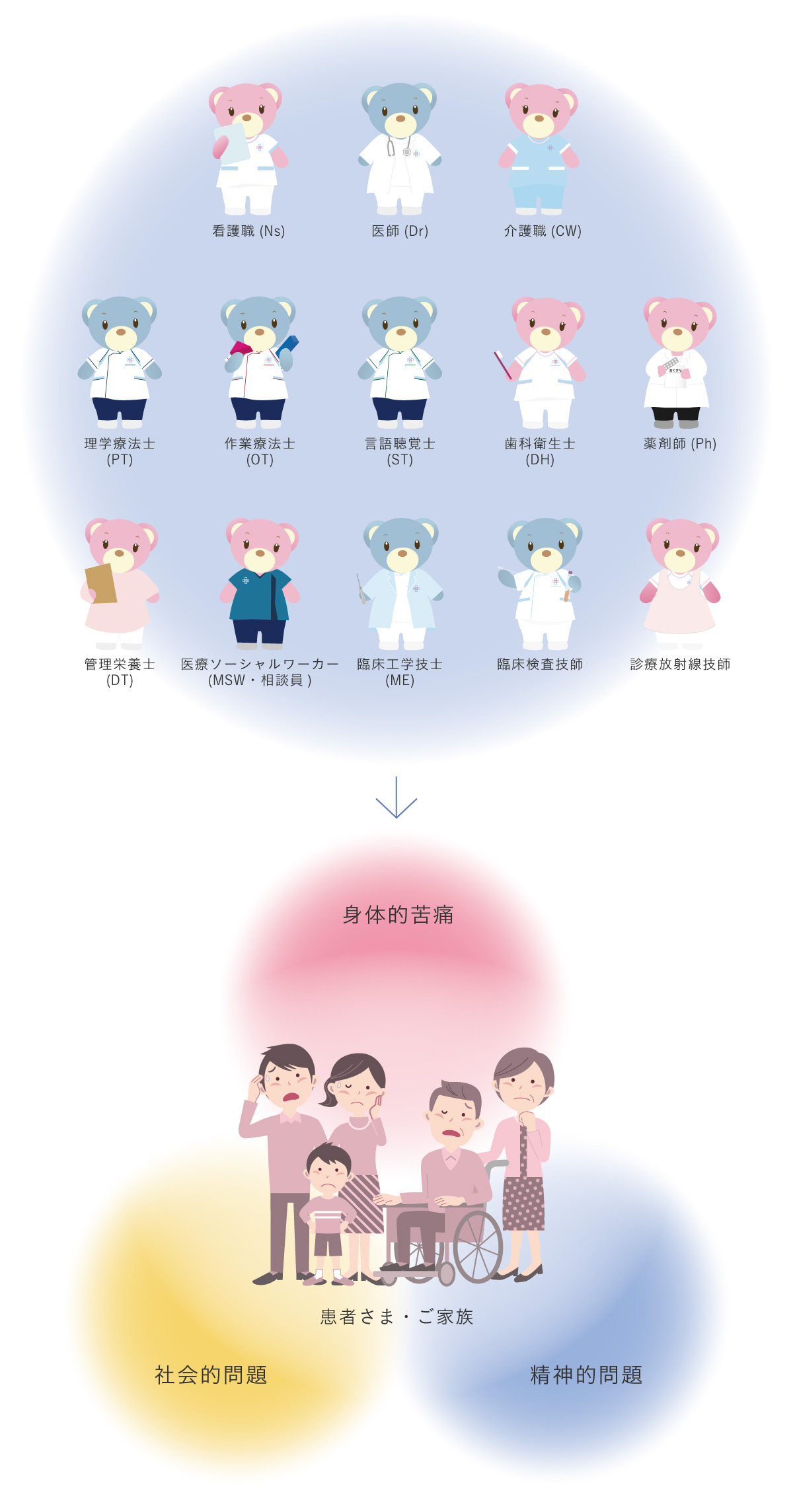 病院は、病める人を社会復帰させることを目的とし、医師をはじめとする多くの職員の連携と協力による「チーム医療」に取り組んでいます。医局・看護部・リハビリテーション部・薬剤科・栄養管理部・地域連携室・臨床検査科・放射線科・医療機器管理科・事務局などで働いている専門職種がチームを組んで、それぞれの専門分野での経験や知識、技術を集約して、患者さまに最も適した最新の治療にあたっています。また、適切なアドバイスや必要な情報提供を行って早期社会復帰への手助けをしています。また、長期療養や緩和ケアを目的として入院される患者さまのQOL(生活の質)を上げるための介入も行っています。