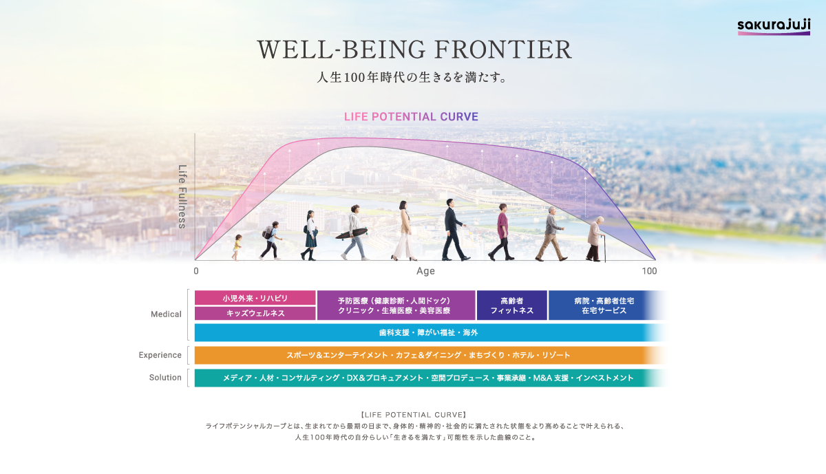 創業時に抱いた「人々が微笑みながら集う場所でありたい」という想いは、20年の歩みを経て、社会全体へと広がるビジョンへ進化しました。医療を確かな基盤としながら、暮らし、体験、社会のあり方までを見据え、人生100年時代の「生きる」を満たす存在であり続けること。新しいグループロゴとともに、桜十字グループは WELL-BEING FRONTIER として、未来を切り拓く挑戦を続けていきます。