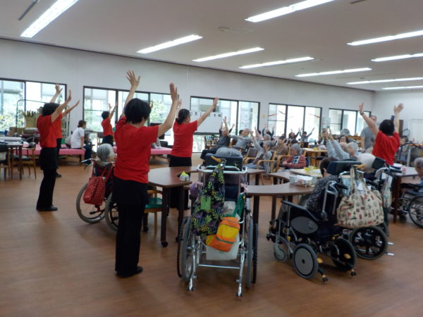 2016/10/31 イベント関連 リズムに乗って♪健康体操 今月も地域のボランティア団体様にお越しいただき、 音楽に合わせて体操する”リズム体操”を行いました。 いつもは体操を見学するだけのお客さまも、 ボランティアの方々の掛け声に合わせて楽しそうに体操される光景がみられました。 ただただ体操をするだけでなく、懐かしい音楽に合わせて歌を口ずさみながらする体操は、 心から元気になれるリハビリです。 また来月もお越し頂けるのが楽しみです。 リズム体操にご興味のある方は、ぜひご見学にいらしてください。 前の記事へ 次の記事へ