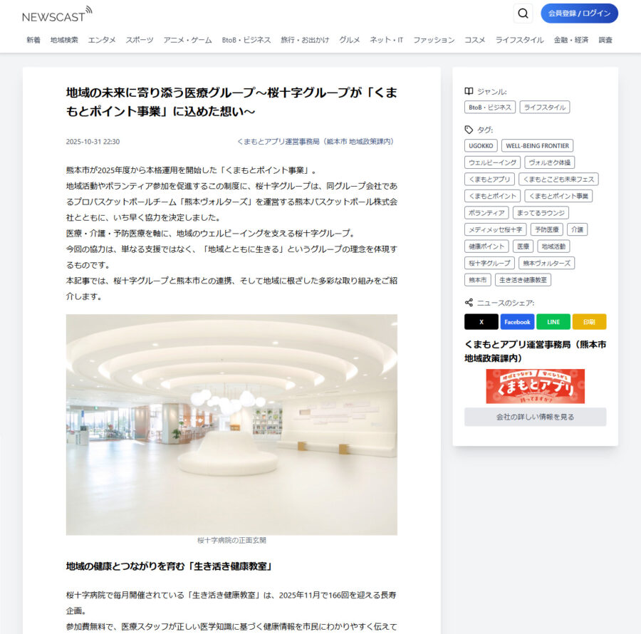 熊本市が推進する「くまもとポイント事業」に桜十字グループが協力している取り組みが、プレスリリースサイト『NEWSCAST』で紹介されました。