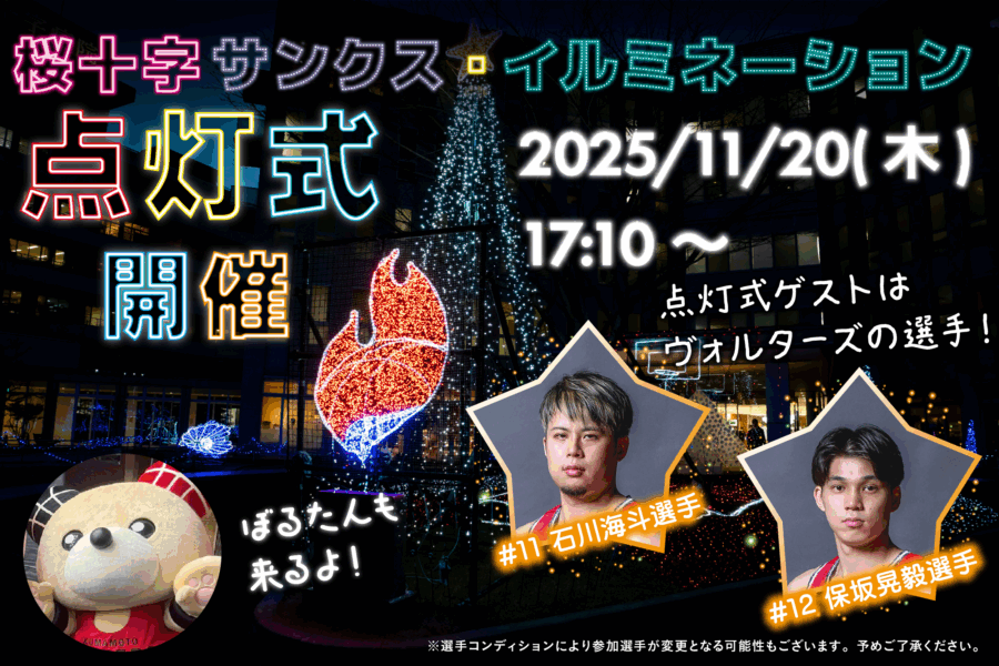 点灯式ゲストとして、熊本ヴォルターズの石川海斗選手、保坂晃毅選手、そして大人気のぼるたんが登場します!点灯式後には、石川海斗選手、保坂晃毅選手と一緒の写真撮影会も開催!