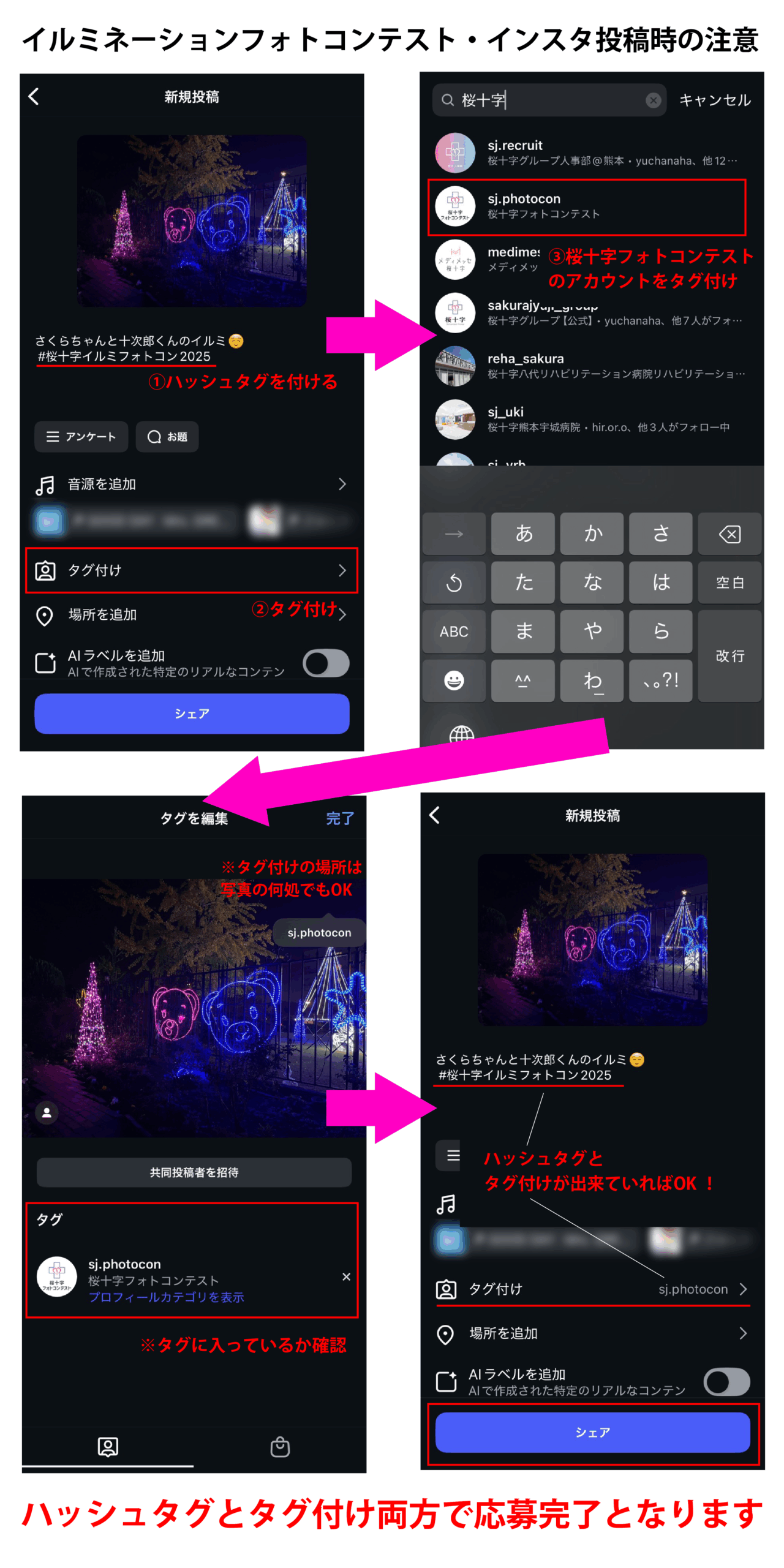 3.キャプションにハッシュ(#)タグ 「 #桜十字イルミフォトコン2025 」を付ける